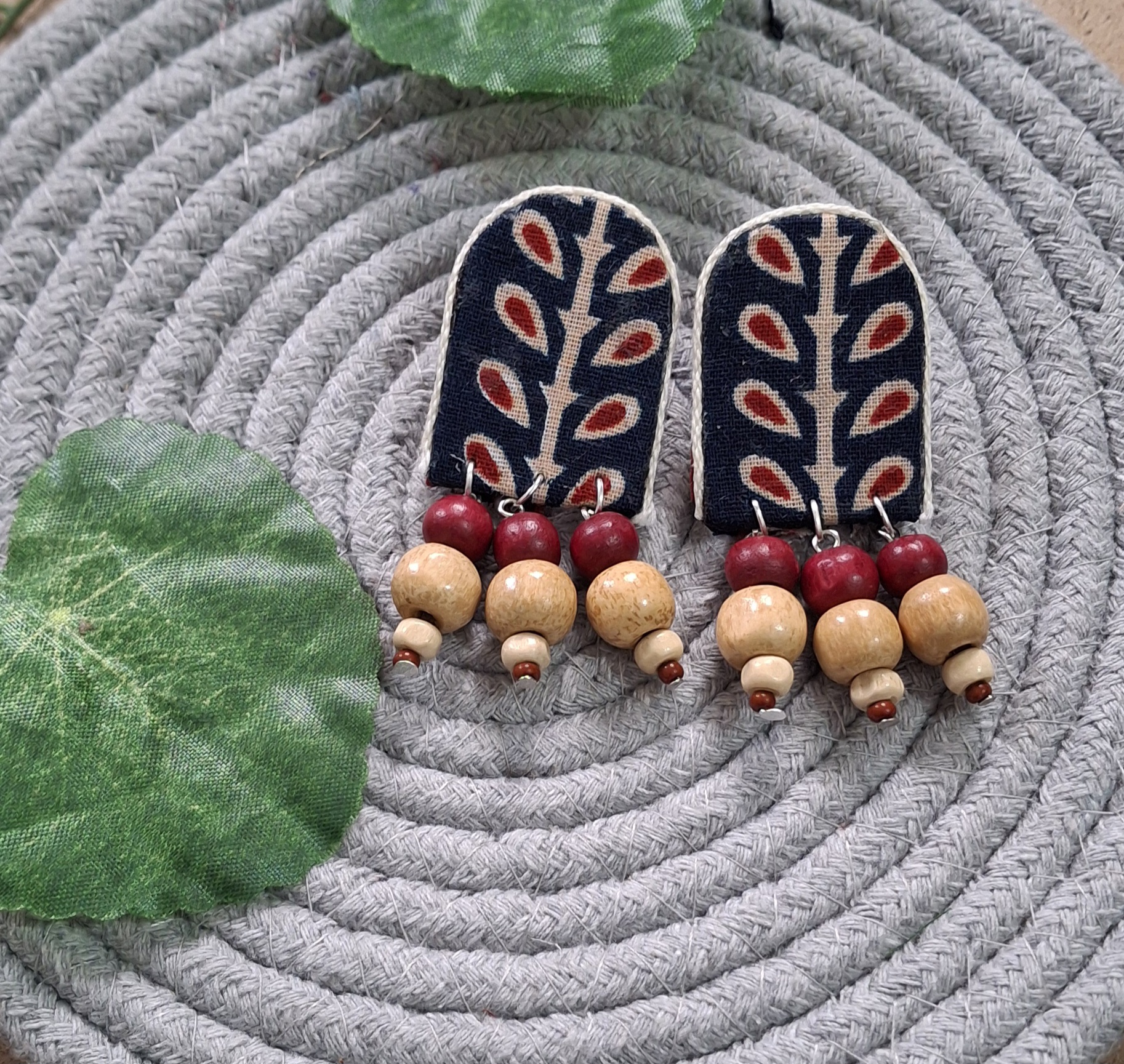 Graceful elongated studs in classic Ajrakh print, accented with a playful cascade of red and natural wooden beads. A perfect blend of tradition and movement, ideal for adding a vibrant ethnic flair to your look.
