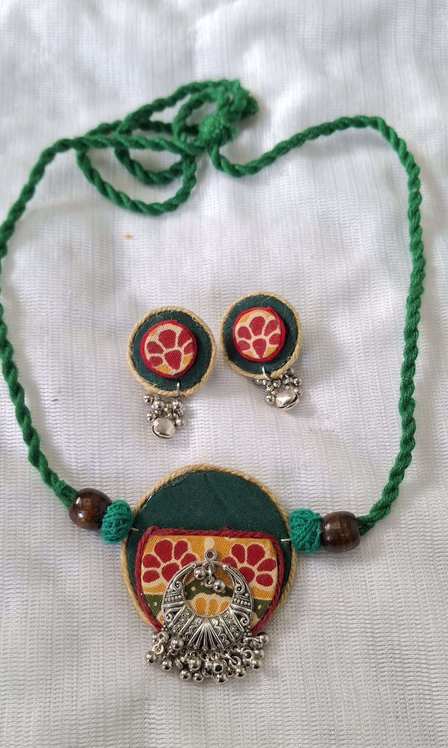 The adjustable green thread dori ensures a comfortable fit, while wooden bead accents enhance the ethnic appeal. The set is paired with matching fabric stud earrings, making it a complete statement jewellery set for festive wear, casual ethnic outfits, or special occasions.