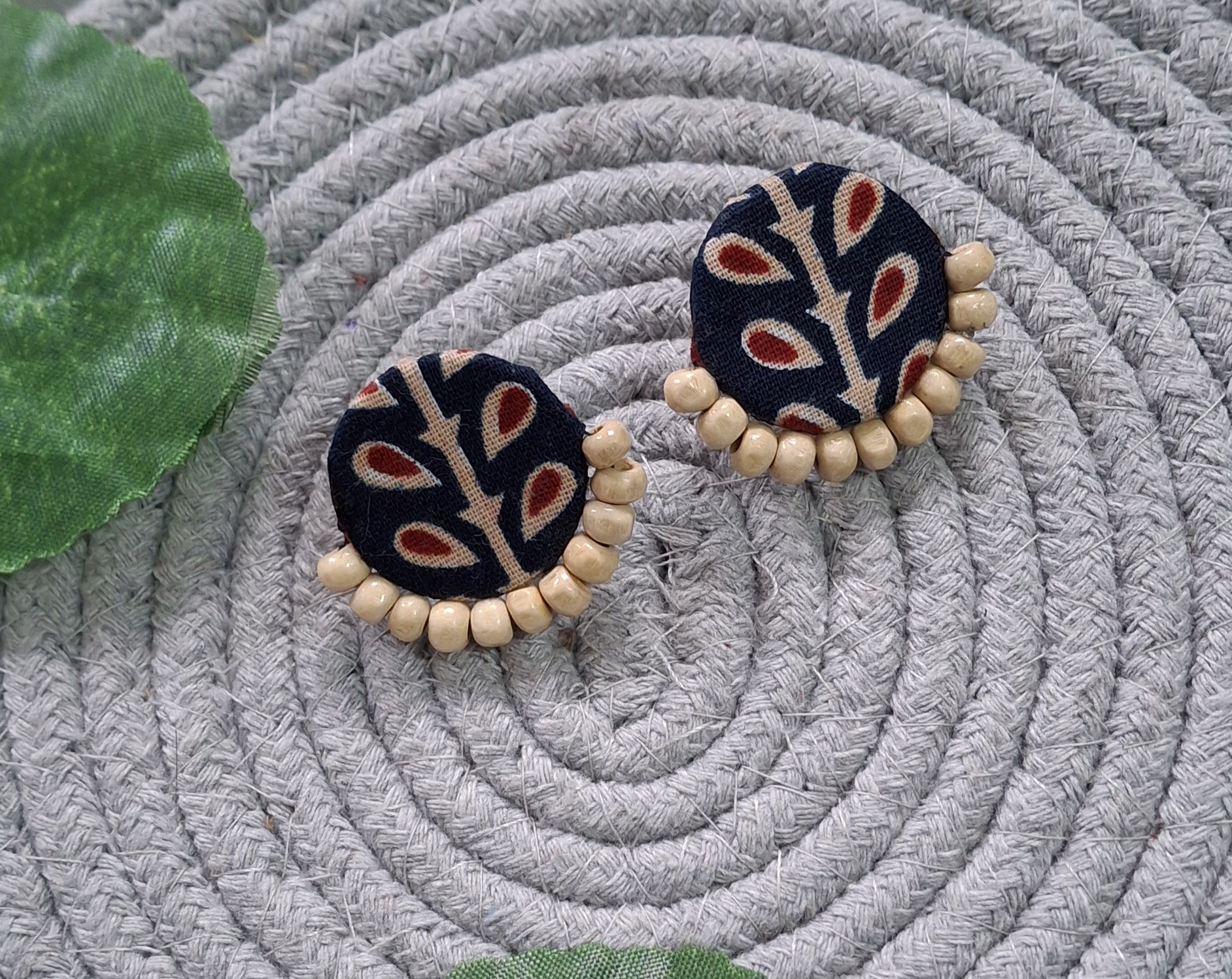 Elegant round studs crafted from deep-toned Ajrakh fabric, highlighted with intricate red and beige motifs for a timeless ethnic charm. Finished with a delicate border of soft wooden beads, these earrings add a subtle yet sophisticated touch to everyday and festive looks.