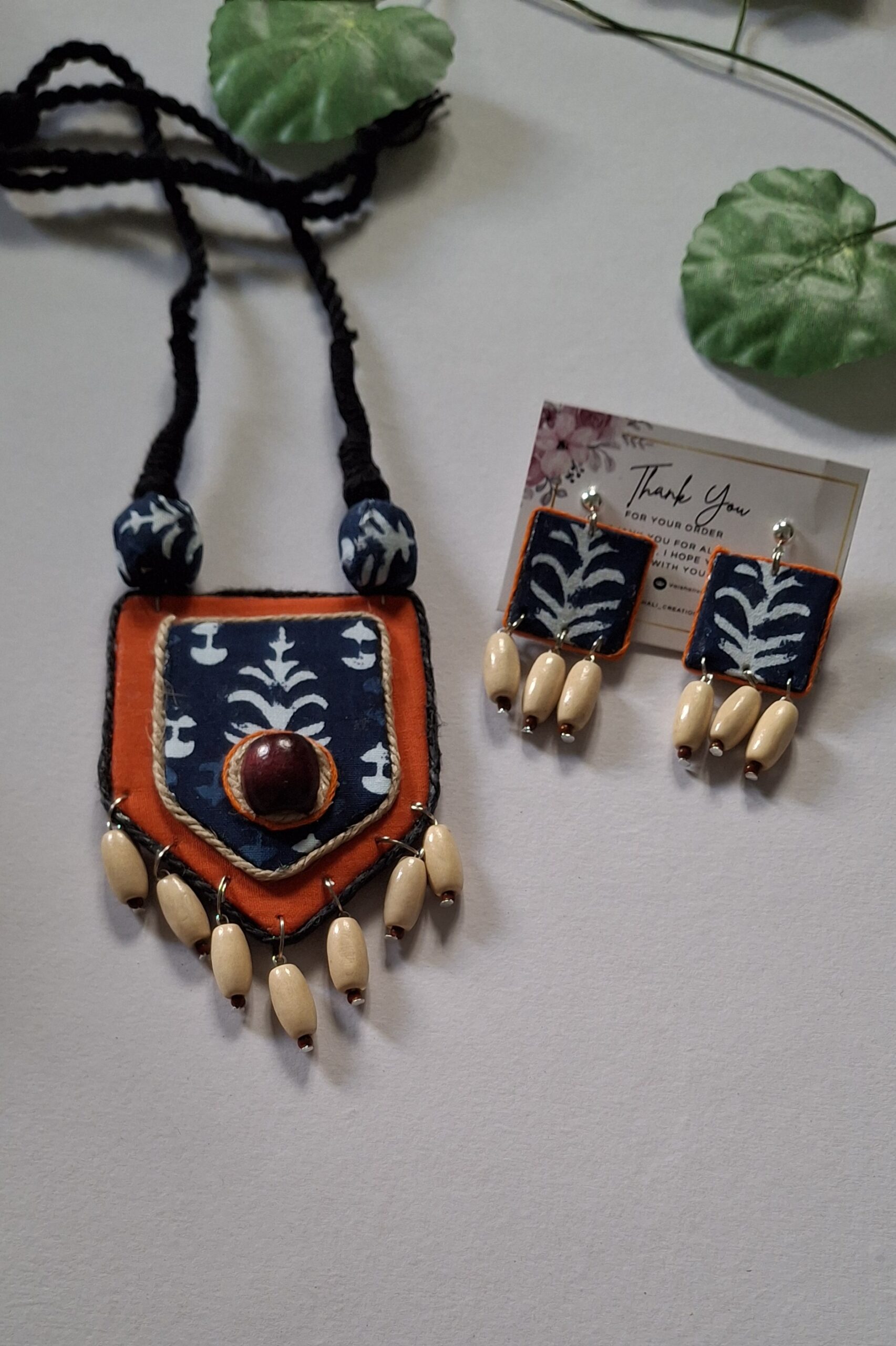 This necklace features a striking indigo fabric motif framed in warm rust tones, creating a bold tribal-inspired look. The center pendant is enhanced with a handcrafted bead, while the bottom is adorned with dangling wooden beads that add natural rhythm and movement to your outfit.