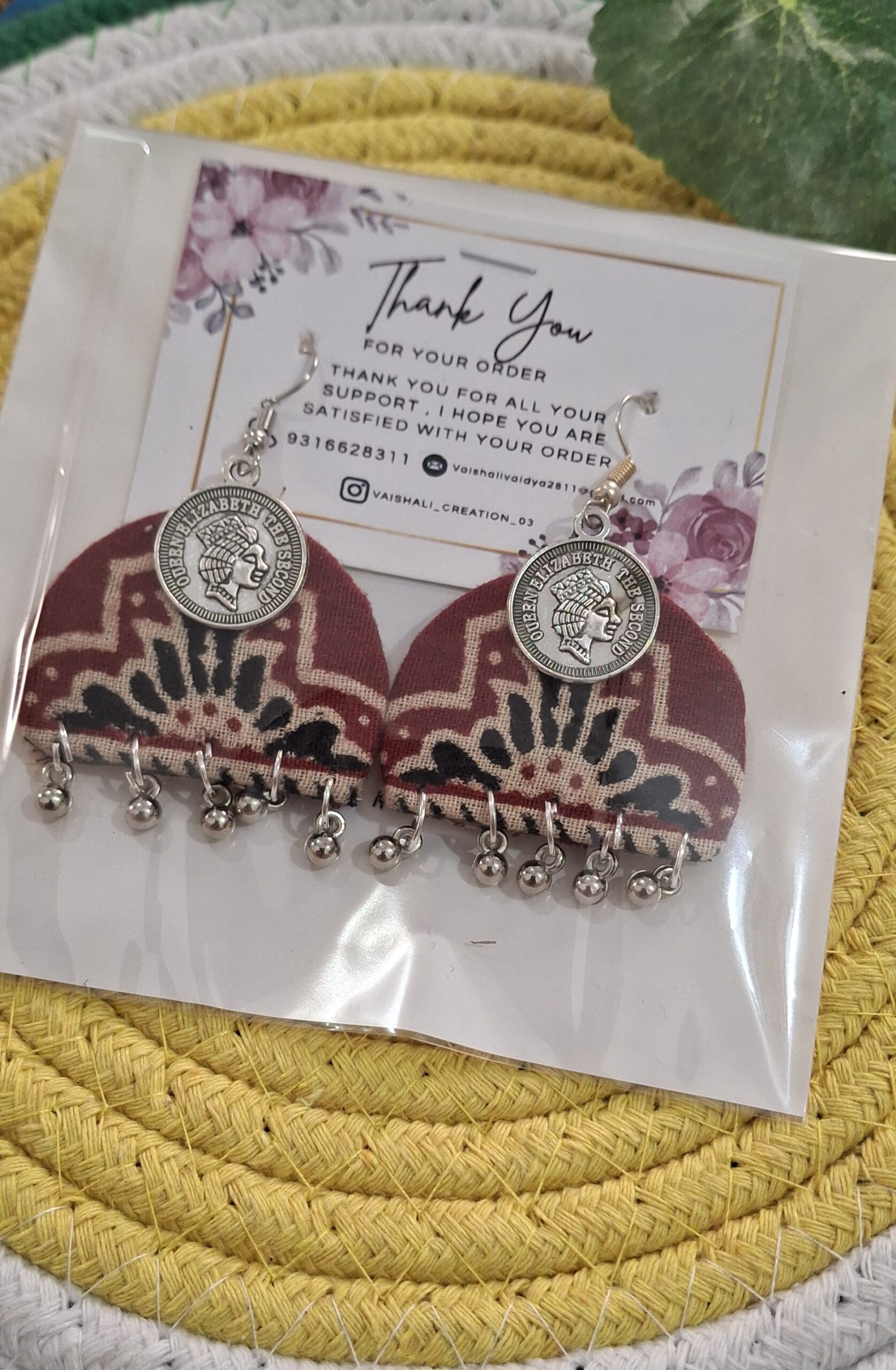 Handcrafted earrings featuring earthy printed fabric paired with antique-style coin charms and delicate metallic danglers. A unique fusion of vintage aesthetics and boho elegance, perfect for statement styling.
